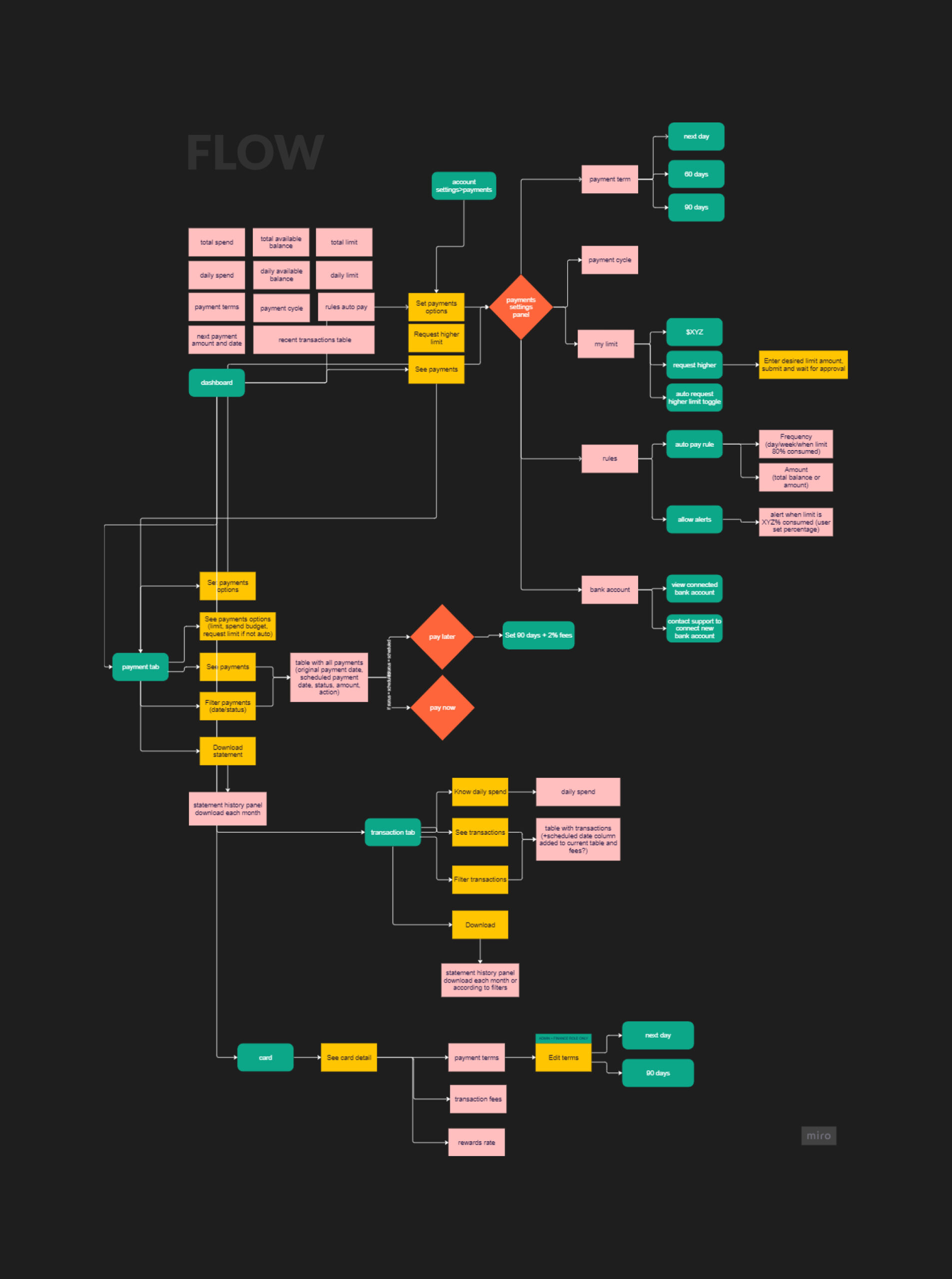 From a product design perspective, offering either multiple fixed-term products or a single flexible product posed trade-offs. Fixed-term options like 30, 60, or 90 days provided predictability but limited flexibility for variable cash flows. A flexible payment approach allowed users to tailor terms to business seasonality and cash flow needs but added complexity to the interface.To balance customization and simplicity, I designed a user flow where users could see their current payment terms on the dashboard and adjust terms at the account or individual card level. Users could track outstanding balances, upcoming payments, and available funds, while detailed transaction history ensured transparency and informed decision-making.
