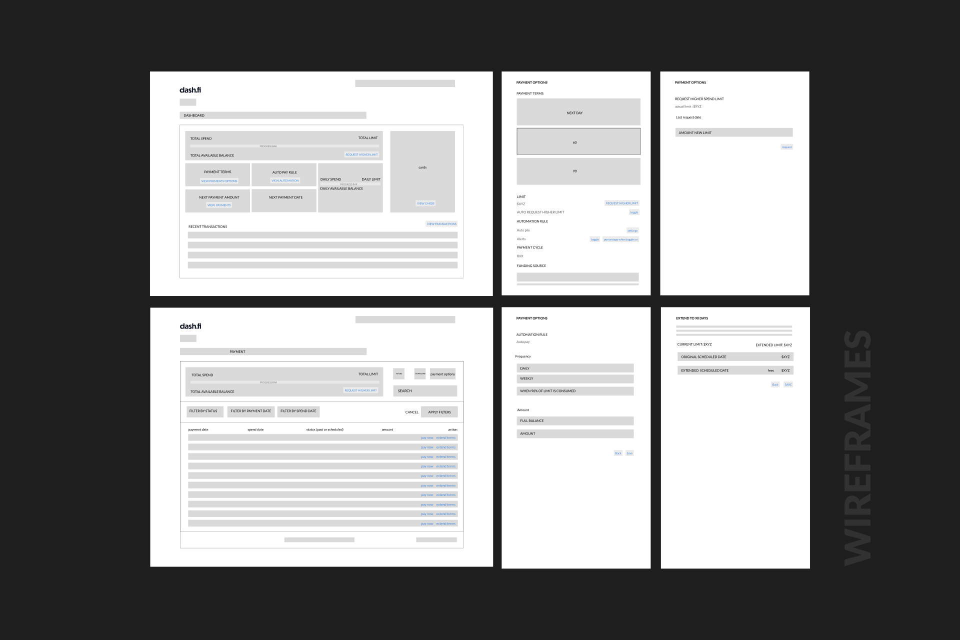 The final solution was a single BNPL product with flexible payment terms. Users could create individual cards tailored to cash flow and business seasonality, with repayment terms managed at both the account and card level. A consolidated dashboard provided visibility into past and scheduled payments, fees, and outstanding balances, complemented by a real-time progress bar to track spending. A financial health check at the account level determined eligibility for longer repayment terms, mitigating risk for Dash.fi while maximizing flexibility for users.